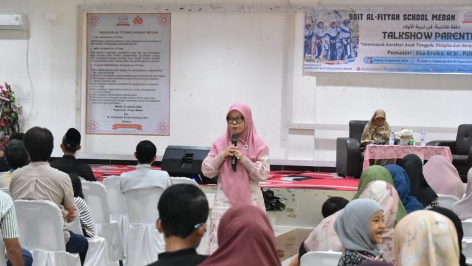 Medan, 9 Agustus 2025 – SD Al-Fityan School Medan menggelar Pertemuan Orang Tua Murid dan Guru (POMG) dalam bentuk Talk Show Seminar Parenting bertema “Membentuk Karakter Anak Tangguh, Disiplin, dan Berprestasi”. Acara berlangsung pada Sabtu, 9 Agustus 2025, di Aula Al Furqon, mulai pukul 08.00 WIB hingga selesai, dengan dihadiri 129 wali murid dan 25 panitia.