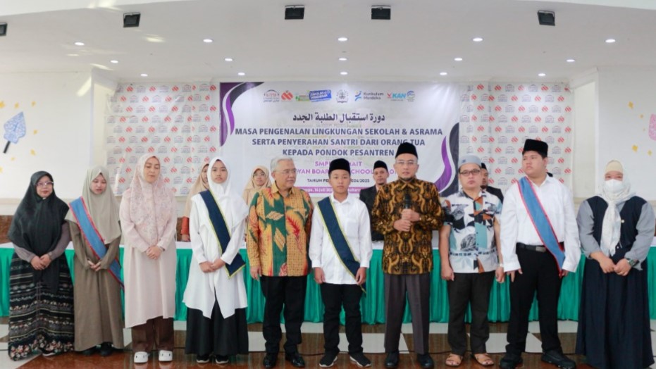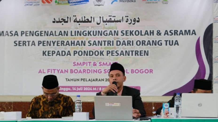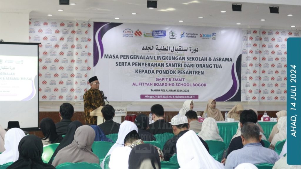 Bogor – Kegiatan serah terima santri baru Pondok Pesantren Al-Fityan Boarding School Bogor (ABSB) berlangsung hikmat pada Ahad, 14 Juli 2024. KH. Taufik Haris Lubis, Lc., selaku Mudir, menerima secara simbolis empat putra-putri dari total 82 santri/wati SMP dan 15 santri/wati SMA dari seorang perwakilan wali santri. Prosesi peresmian sebagai santri baru ditandai dengan pemberian slempang oleh Mudir ABSB.