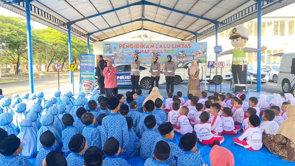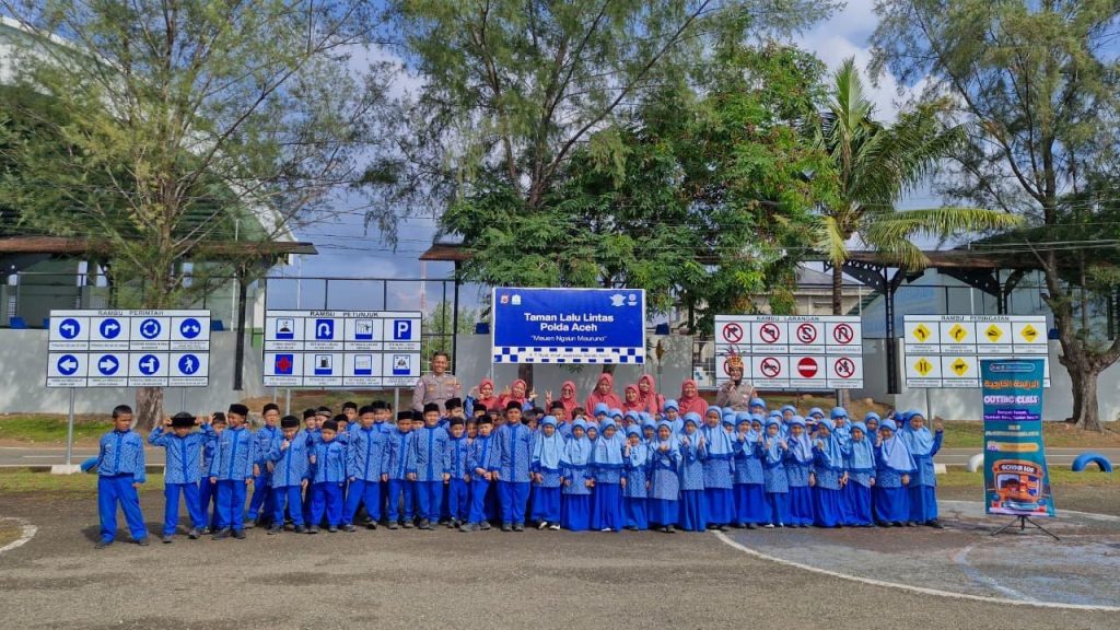 Dengan mata penuh rasa ingin tahu, para murid diajak berkeliling area Polda Aceh. Mereka menyimak dengan antusias setiap penjelasan dari petugas. Berbagai atribut kepolisian, mulai dari seragam, peralatan, hingga rambu-rambu lalu lintas, menjadi objek pengamatan langsung yang memicu banyak pertanyaan kritis dari para siswa.