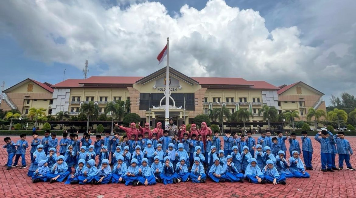 Dengan mata penuh rasa ingin tahu, para murid diajak berkeliling area Polda Aceh. Mereka menyimak dengan antusias setiap penjelasan dari petugas. Berbagai atribut kepolisian, mulai dari seragam, peralatan, hingga rambu-rambu lalu lintas, menjadi objek pengamatan langsung yang memicu banyak pertanyaan kritis dari para siswa.