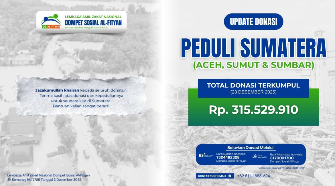 Jakarta, 23 Desember 2025 – Bismillahirrahmanirrahim. Dengan penuh syukur, Dompet Sosial Al-Fityan menyampaikan perkembangan terkini penggalangan dana untuk korban bencana di Sumatera hingga tanggal 23 Desember 2025.